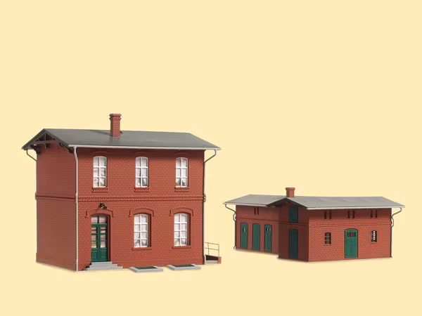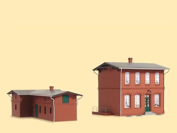 Trafikledningsbyggnad med fristående förråd. Mått (trafikledningsbyggnad) 13,0 x 10,0 x 12,0 cm respektive (förråd) 14,2 x 8,8 x 6,0 cm. Byggsats (plast). Utgående artikel.
