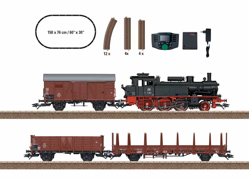 Ånglok typ BR74 (med fabriksmonterad mfx digitaldekoder) samt tre vagnar. Loket har belysning som växlar i körriktningen. Tågets totala längd 51,0 cm. Satsen innehåller 12 böjda skenor TR62130, 4 raka skenor TR62172, 4 raka skenor TR62188, körreglage Mobile Station och transformator 18VA. Spårovalens storlek är 150 x 76 cm och kan byggas ut med Trix utbyggnadssatser och hela sortimentet Trix C-skenor.