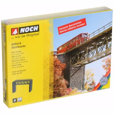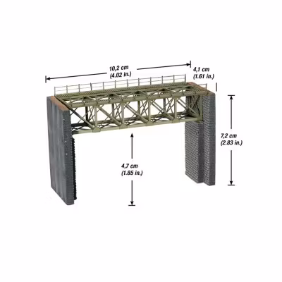 Bro med två mycket väldetaljerade formpressade fundament/bropelare. För enkelspår. Längd 10,2 cm, bredd 4,1 cm, höjd 7,2 cm. Genomfartshöjd under bron 4,7 cm. Byggsats (Lasercut).