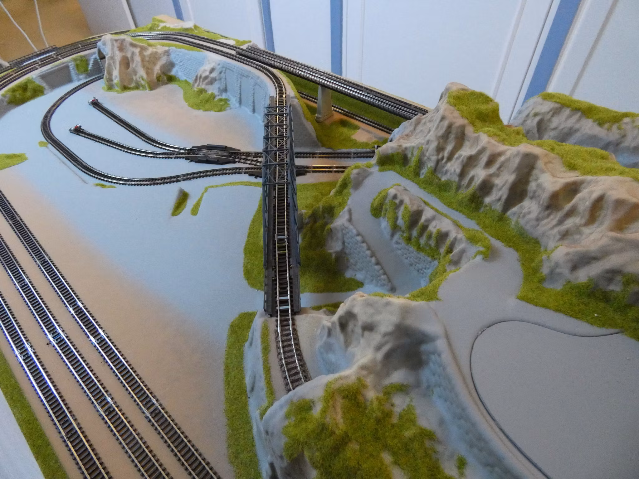 Nochlayout i skala N med Fleischmann N Track-räls utan banvall. Två manuella växlar samt tre eldrivna växlar (varav en dubbel korsningsväxel) manövreras med medföljande Roco ställpult. Två tågsätt kan köras samtidigt var sin slinga. Tre långa spår vid stationsområdet samt tre stickspår på magasins-/industriområdet. Tre broar. Trådlös digital körkontroll från ESU samt transformatorer för körström och belysning medföljer. Mått ca 140 x 69 cm. Pris 9.900 kr (för benställning i lättmetall tillkommer 2.900 kr). Anläggningen kan avhämtas i vår utställningslokal eller fraktas med vår bil direkt till kunden (fraktkostnaden är 1.000-2.000 kr beroende på avstånd, dock max 70 mil enkel väg).