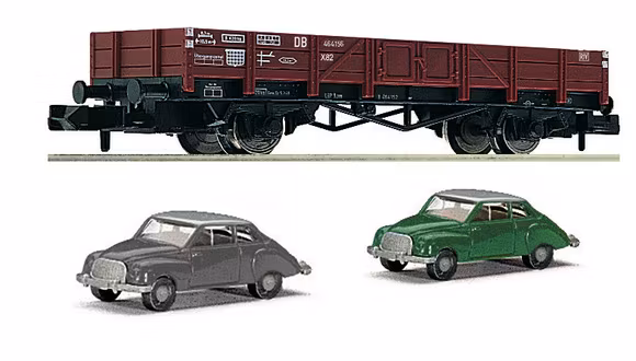 FL820003 - Flakvagn DB - Fleischmann N 199 kr I lager. Lägg i korgen Artikelnummer: FL820003 Information Typ X90. Lastad med två DKW personbilar. Längd 6,3 cm. DB epok III.
