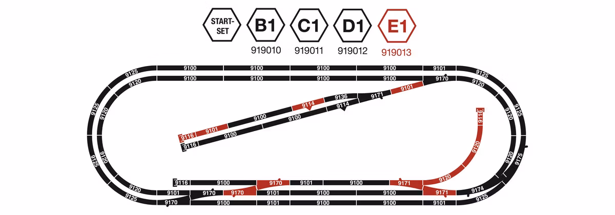 Lämplig bl a för att bygga till ytterligare spår på utbyggnadssats B1 (FL919010) , C1 (FL919011) och D1 (FL919012). Satsen innehåller 2 raka skenor FL9101, 2 manuella vänsterväxlar FL9170, 2 manuella högerväxlar FL9171, 1 manuell avkopplingsskena FL9114, 2 böjda skenor FL9120 och 1 slutskena med stoppbock FL9116. Växlarna kan kompletteras med växelmotor FL640000 och växelsignal FL944001. Avkopplingsskenan kan kompletteras med motor FL9414.